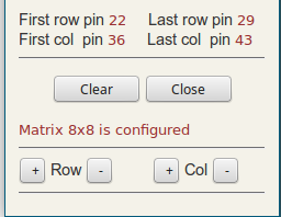 Press "Matrix inputs" button (to the left of the board picture). In the matrix dialog window you will be asked to select pins for matrix rows and columns. Select four Arduino pins one by one - the first and the last matrix row pins, then the first and the last matrix column pins.