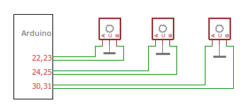 Similar to the "Key_matrix" input method, the "Encoder Port" in ArdSimX serves to increase the number of encoders connected to one board. Each encoder uses one output pin of Arduino (blue on diagram). Two input pins (red on diagram) are used as bus (or "port") for reading all encoders. (You need to select two pins in configurator as "Encoders Port" before assigning encoders for bus connection).