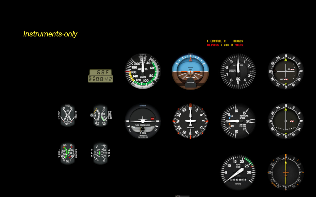 This instrument-only version is for those who build a full "hardware" panel with cover plates made of plastic, metal, plywood or cardboard covering the monitor screens, containing only cut-outs for instruments and indicators. We already have quite a large collection of instruments, and you can customize any panel that uses these instruments. Every instrument is made as close to original as possible and has real sizes on the chosen LCD screens.