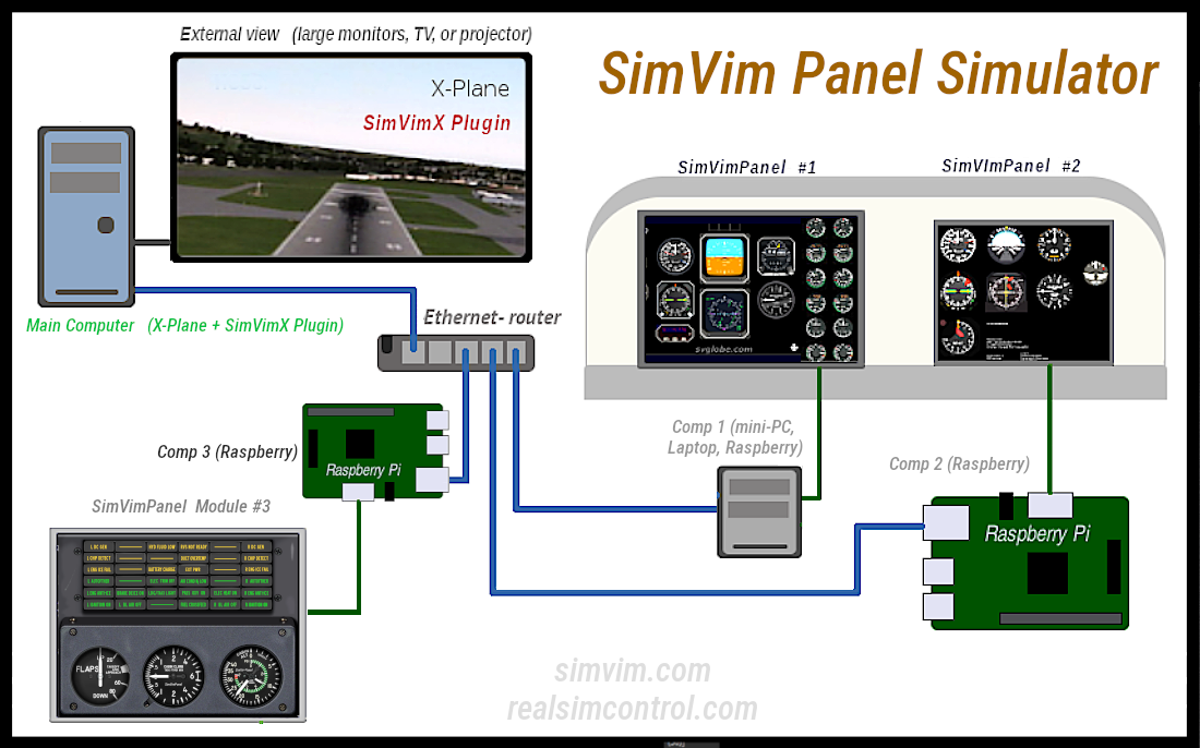 SimVimPanel is a standalone program running a set of realistic, fully-functional aircraft instrument panels on a computer that is connected by network to the main computer with X-Plane.